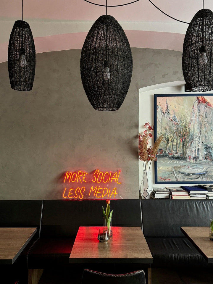 Náš neonový nápis 'More Social, Less Media' je nejen dekorativním prvkem, ale i způsobem, jak přinést do vašeho života smysluplnost. Zapomeňte na digitální ruch a vrátte se k radosti skutečného společenství.