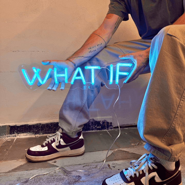 Co kdybychom si dovolili snít bez hranic? Náš neonový nápis 'What If' otevírá brány neomezené kreativity a možností. Tento světelný nápis je jako otázka, kterou si klade každý vizionář, který chce objevit nové horizonty a nalézt odpovědi na nekonečné možnosti života.