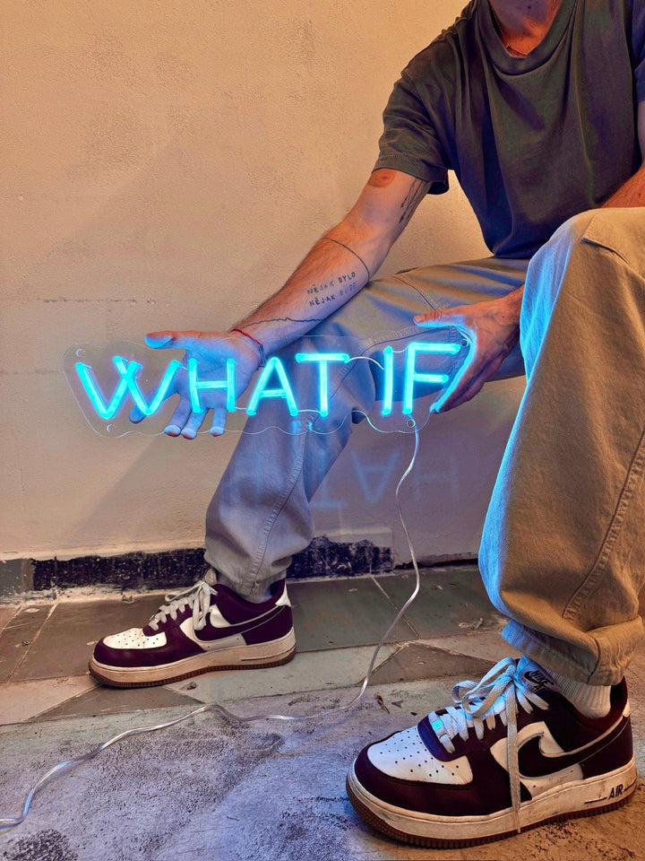 Co kdybychom si dovolili snít bez hranic? Náš neonový nápis 'What If' otevírá brány neomezené kreativity a možností. Tento světelný nápis je jako otázka, kterou si klade každý vizionář, který chce objevit nové horizonty a nalézt odpovědi na nekonečné možnosti života.